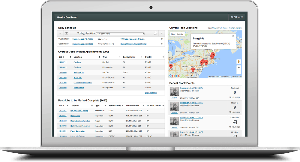 A GPS job clock tells everyone the location and status (en route, arrived, planning, departed) of the technician. These records also provide assistance in billing and payroll calculations. Any calculation by fleet tracking apps on job hours for billing is just guessing because the technician did not affirm whether the job work had started or whether he was eating a cheeseburger in the truck. With ServiceTrade, we record what the technician tells us to record when he punches the buttons on the smartphone app (and nothing more or less).