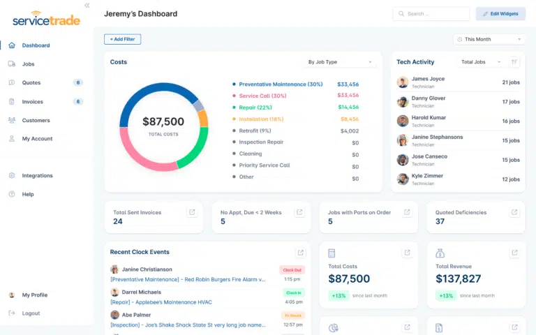 Custom ServiceTrade Dashboard: Completely customizable by role so that you can keep what matters most front and center, this drag and drop dashboard offers quick visibility into your daily and weekly priorities to more easily manage your workload.